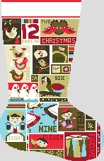Our 12 Days of Christmas Stocking Needlepoint kit is a stocking rich in holiday detail and design. Based on the classic holiday song, where a series of increasingly grand gifts are given to one's true love, on each of the twelve days. A fabulous project to stitch for the holidays to adorn your fireplace. Be sure to personalize this stocking by including a name at the very top. (DMC embroidery floss is optional, does not include finishing materials) GG