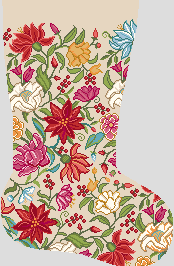 An abundance of florals playfully dance in this colorful tapestry of flowers! From our needlepoint collection inspired by the natural forms and curvaceous lines of the Art Nouveau movement. A charming new floral design to freshen up your holiday stockings! (DMC embroidery floss is optional, does not include finishing materials) (GG)